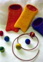 ふわふわの原毛に石けん水をかけてこすっていくと、フェルトができあがります。この一日講座ではチョーカーと「ウオモ」(メガネや携帯が入るケース)を作ります。