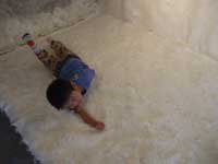 奥壁面は長いつややかな毛のゴッドランド、長椅子の背は柔らかなメリノの毛を使ったフェルト、 転げてます〜♪